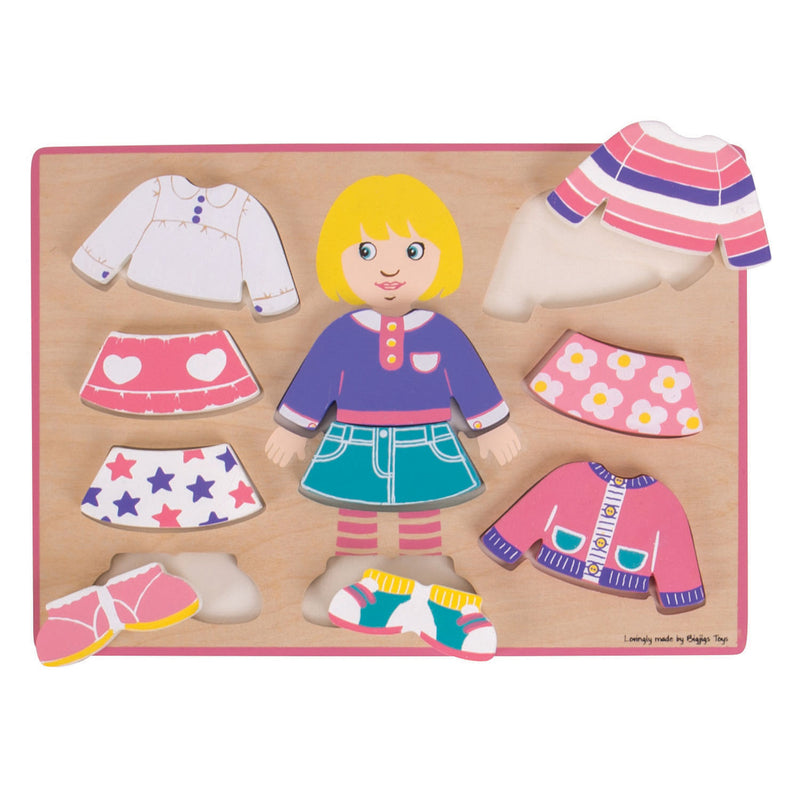 Deze houten aankleedpuzzel is perfect voor kinderen vanaf 12 maanden. Het bestaat uit 10 puzzelstukken waarmee je het juiste shirt, broek en schoenen kunt kiezen om een complete outfit te maken. Help dit meisje met aankleden en stimuleer haar creativiteit en fijne motoriek.
